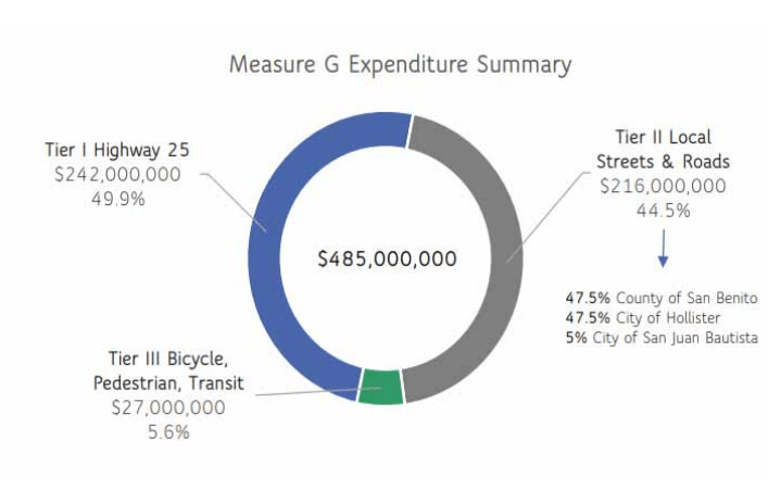 Measure G is a 30 year, 1% transaction and use tax that was approved by San Benito County voters in 2018. The measure is intended to improve our local roads, reduce congestion and improve connectivity. It is expected to generate over $485 million dollars over 30 years. The breakdown of where those funds will be spent is below: