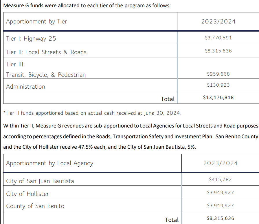 Over the 2023-2024 period Measure G funds were collected and distributed as follows: