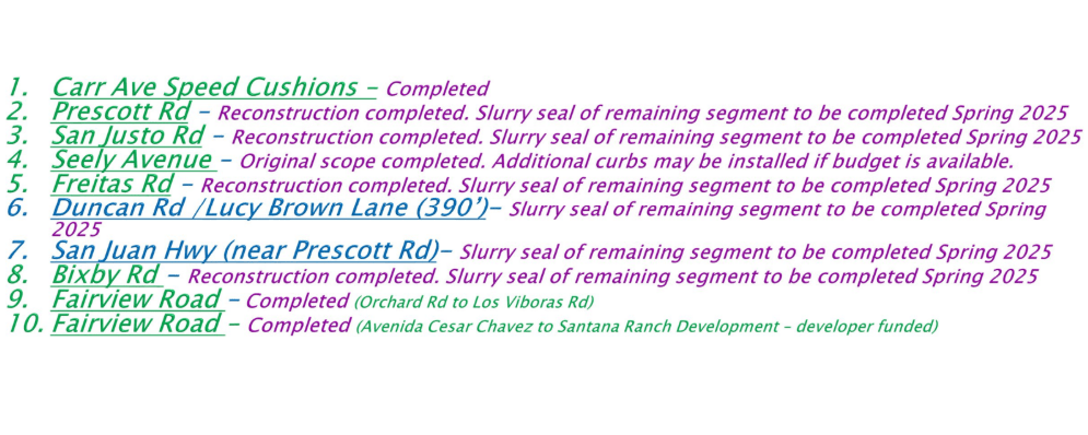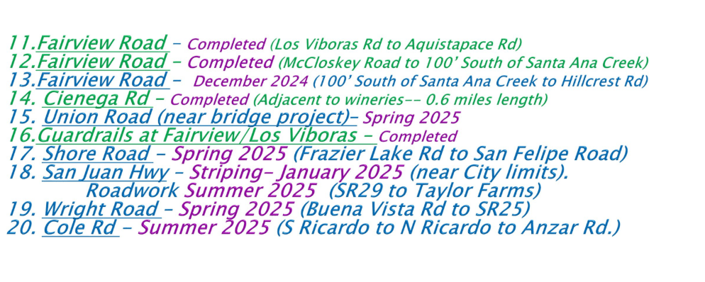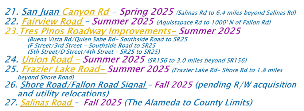 As you can see 2025 leaves a lot to look forward to as far as our arterial (major) roads go with 12 major projects. With Shore, Frazier Lake, the rest of Fairview, and Union being completed most major roads in and out of Hollister will have been addressed. Mr. Loupe also mentioned that once our arterial roads are completed that they’ll move on to improving our collector (or more local roads) within county jurisdiction.