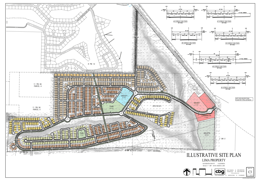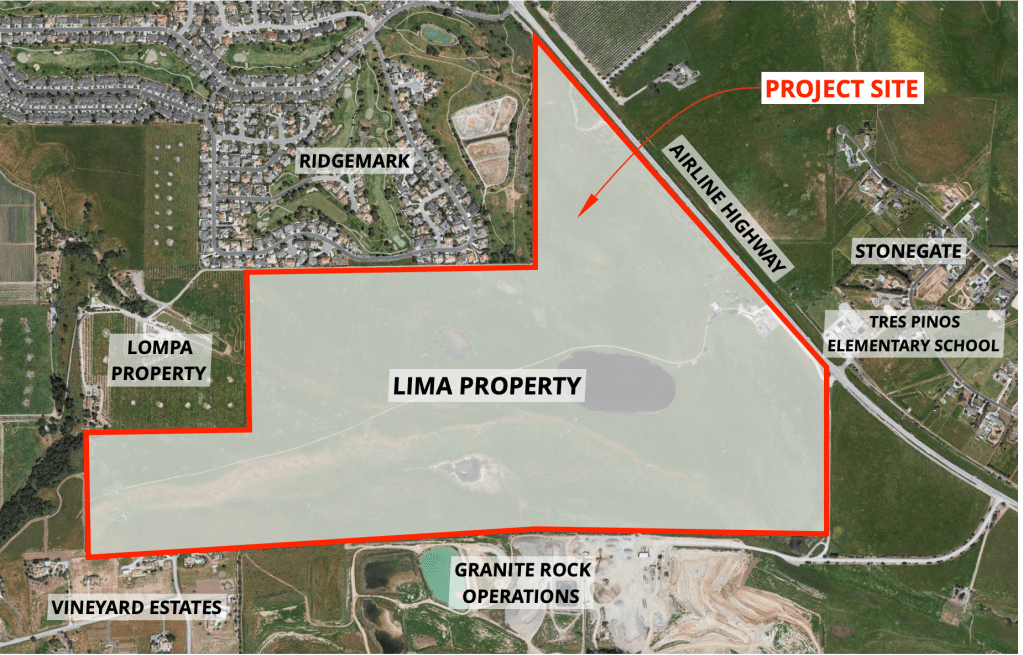 Lands of Lima is situated just north of Granite Rock and south of Ridgemark. It’s primary entrance will use the intersection near Tres Pinos Elementary with proposed connections to Airline Highway further north and Vineyard Estates on the back end. The project is working with Sunnyslope Water and Tres Pinos Sewer District for utilities.