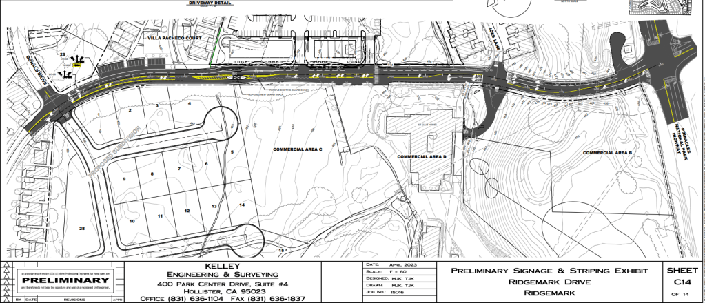 Proposed improvements to Ridgemark Drive include the widening of Ridgemark drive to 3 lanes with two lanes heading in and one lane heading out from 25 to Donald Drive, a newly relocated guard house, a new clubhouse/hotel and commercial driveway as well as driveway access to the commercial sites.