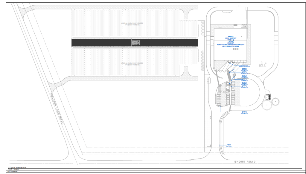 The application is broken down into three phases, the first phase include utilities, a 30 foot high 25,920 square foot agricultural processing facility and about 40 hoop houses (or about 4 acres), parking lot, and access from both Frazier Lake and Shore Roads.
