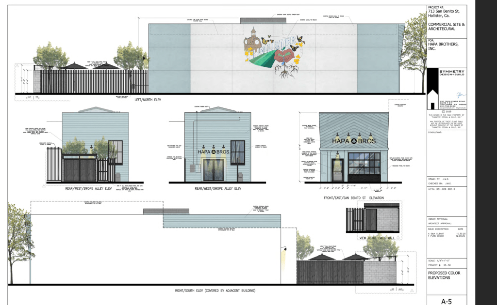 The plans include a full renovation of the exterior, including new lighting, signage, paint, a sectional door upfront and an outdoor patio dining area fronting Swope Alley. The plans will retain the existing Hollister Mural but demolish the storage building in the rear of the building in order to make way for the dining patio.